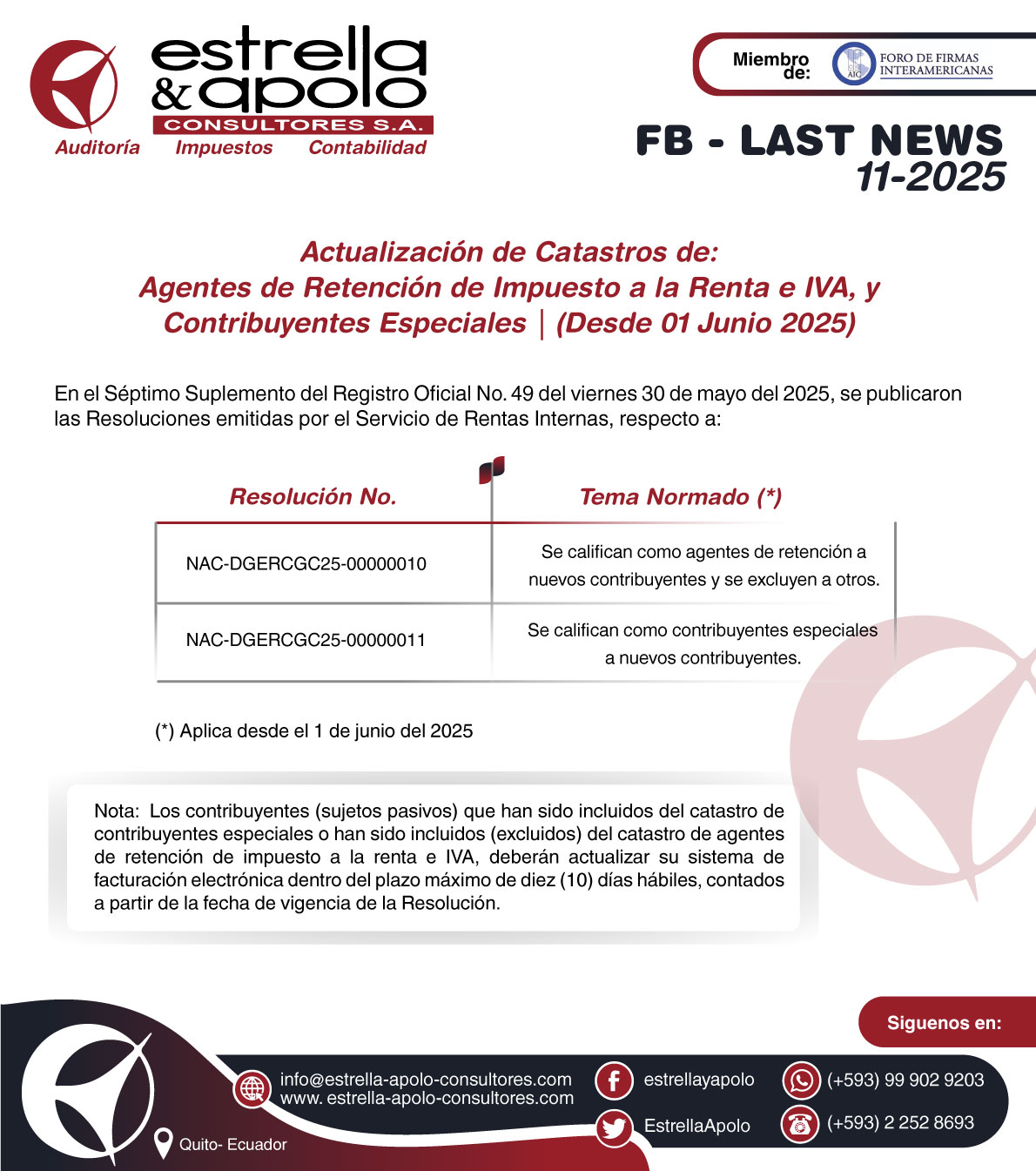 Last News 11-2025 – Actualización de Catastros de: Agentes de Retención de Impuesto a la Renta e IVA, y Contribuyentes Especiales | (Desde 01 Junio 2025)